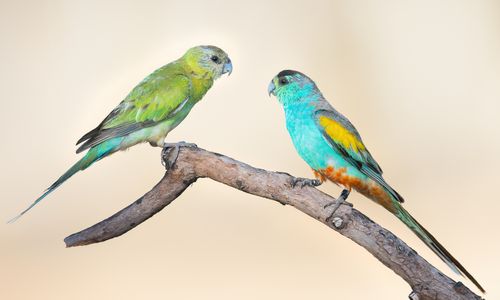 キビタイヒスイインコのメス(左)とオス(右)