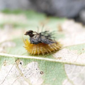 自分のウンコをのっけたイチモンジカメノコハムシの幼虫